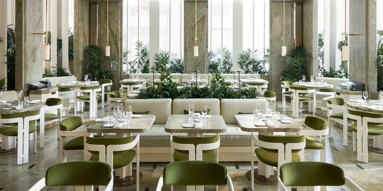 For the new restaurant, the AD100 architect created a greenhouse-like environment framed by the vertical louvers and alcoves of flora